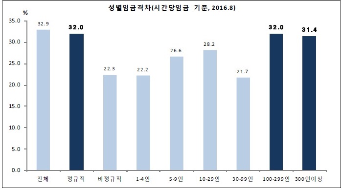 김난주 한국여성정책연구원 부연구위원이 통계청의 ‘경제활동인구조사–근로형태별부가조사’를 분석한 결과, 100인 이상 기업 종사근로자의 정체적인 성별임금격차가 33%에 달하는 것으로 나타났다. 특히 비정규직(22.3%) 보다 정규직(32.0%)이, 성별임금격차가 30% 미만인 100인 미만 보다 30%를 초과하는 100인 이상의 성별임금격차가 상대적으로 큰 것으로 확인됐다.