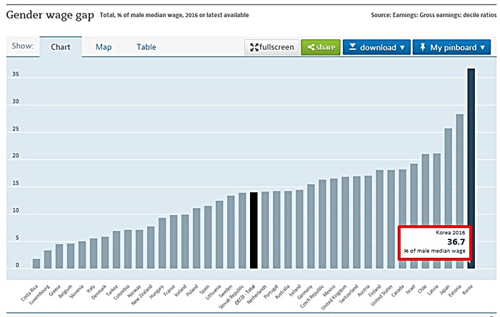 한국은 OECD가 남녀의 임금격차 통계를 조사한 2000년부터 16년째 1위를 차지하고 있다. OECD 회원국 중 가장 높은 수치이자, 성별임금격차가 30%를 초과하는 유일한 나라기도 하다.