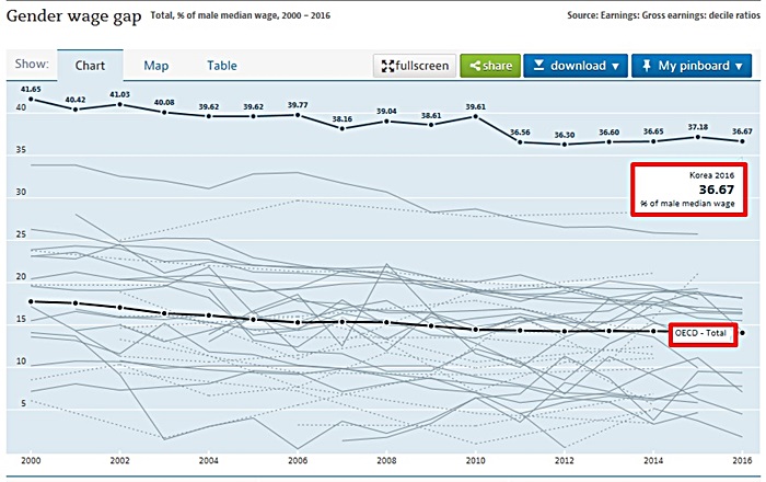 OECD 통계를 살펴보면 한국은 남녀임금격차 개선 속도는 더디다. OECD 남녀임금격차 평균이 2000년 19.2%에서 2016년 14.1%로 5.1%포인트가 줄어드는 동안, 한국은 같은 기간 40.4%에서 36.7%로 3.7%포인트 하락하는데 그쳤다. 일본은 2000년 33.9%에서 2015년 25.7%로 8.2%포인트 줄었고, 영국은 2016년 26.3%에서 16.8%로 10.3%포인트가 내려갔다.