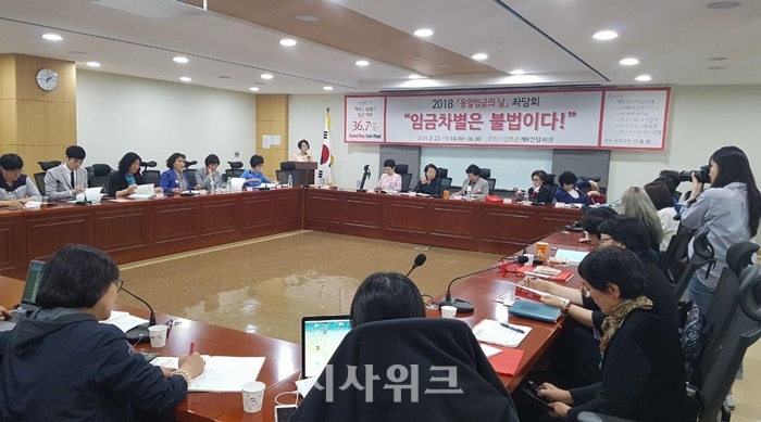 지난 23일, 여의도 국회 의원회관에서 진행된 ‘2018 동일임금의 날 좌담회’에서도 성별임금격차에 대한 현주소를 성토하는 목소리가 뜨거웠다. 특히 19대 국회 임기 만료로 폐기된 동일임금의 날 제정 법안이 20대 국회 전반기가 지나도록 논의조차 되지 않는 상황에 대한 엄중한 문제제기가 이어졌다.