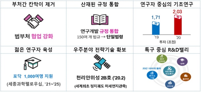 오는 2021년까지 부처 간 R&D 정보를 공유하기 위해 연구지원시스템 통합도 추진한다. 연구개발 혁신특별법을 제정해 산재된 R&D 규정을 체계화할 계획이다. 혁신 성장의 핵심 분야인 정부 3대 신산업 바이오헬스, 미래자동차, 시스템 반도체에 대한 범부처 협업도 강화한다.