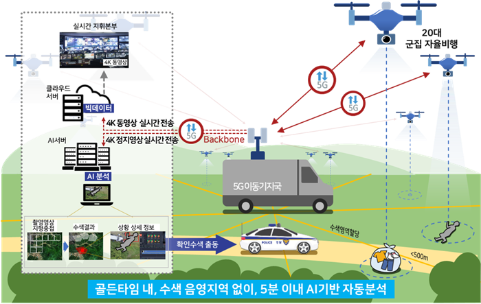 음영지역 극복을 위해 5G통신을 활용한 ‘스몰셀 기술도 적용한다. 스몰셀이란 일반적인 기지국보다 작은 영역을 책임지는 소형 이동통신 기지국을 뜻한다. 또한 통신사 네트워크를 연계한 드론 운용 실증사업과 5G드론 비행시험장 및 드론 운용을 위한 임무 관제 플랫폼 구축도 병행된다.