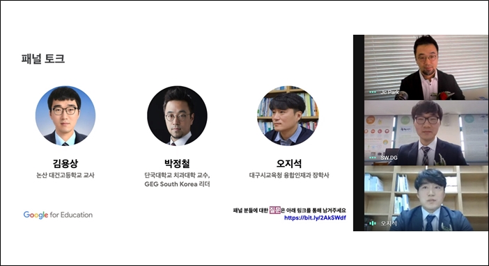글로벌 IT기업 구글코리아가 개최한 13일 온라인 화상 토크 행사 ‘Meet with Educators - 교육자와의 대화’에서는 교육 분야 전문가들이 모여 약 한 달 동안 진행된 원격수업 결과에 대해 평가하고 향후 어떤 개선이 필요한지 의견을 나눴다. 행사에는 논산 대건 고등학교의 김용상 교사와 단국대학교 치과대학 박정철 교수, 대구시교육청 원격수업 담당자 오지석 장학사가 참여했다.