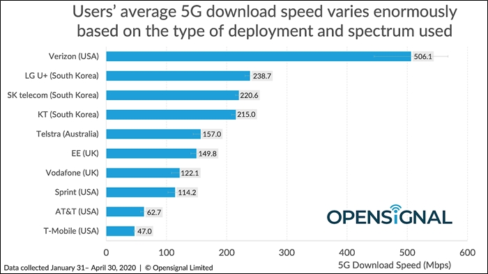 영국의 무선통신서비스 시장조사기관 오픈시그널은 지난 20일 한국, 미국, 영국, 호주 등 5G 상용화 4개국의 통신사 10곳의 5G 평균 속도를 측정해 발표했다. 조사는 지난 1월 31일부터 4월 30일까지 3개월 간 진행됐으며, 5G평균속도는 데이터 다운로드 속도를 기준으로 삼았다.