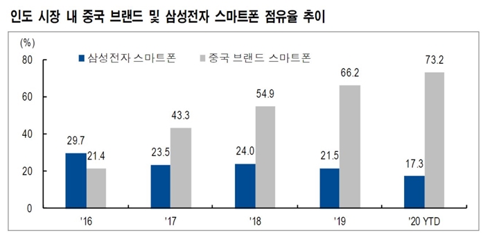 지난 2016년까지 삼성전자의 인도 스마트폰 시장 점유율은 중국 기업을 전부 합친 것보다 높았다. 하지만 2017년 이후, 중국업체들의 추격으로 조금씩 따라잡히기 시작했다. 이후 삼성전자는 업체별 인도 스마트폰 시장 점유율 1위 자리를 2018년 샤오미에게 내줬고, 지난해 4·4분기에 중국의 비보에게 밀려 현재 3위까지 떨어졌다.