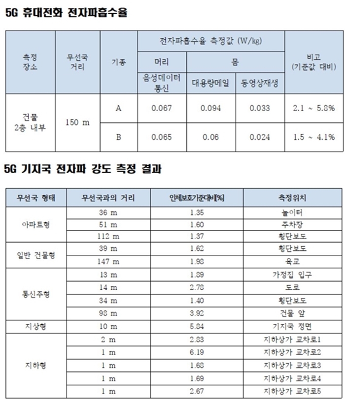 측정 결과 건물 옥상, 통신주, 지하 등에 설치된 5G기지국에서 발생하는 전자파 강도는 전자파 인체보호기준 대비 1.35~6.19% 수준에 불과했다. 특히 고용량 데이터를 지속적으로 내려 받는 경우가 아닌 고화질 동영상을 스트리밍 방식으로 시청하는 경우의 전자파 강도는 더 낮게 나타났다. 5G 서비스를 사용하지 않는 대기 상태에서의 전자파 측정값은 기준 대비 1%에 미치지 못하는 수준이었다.