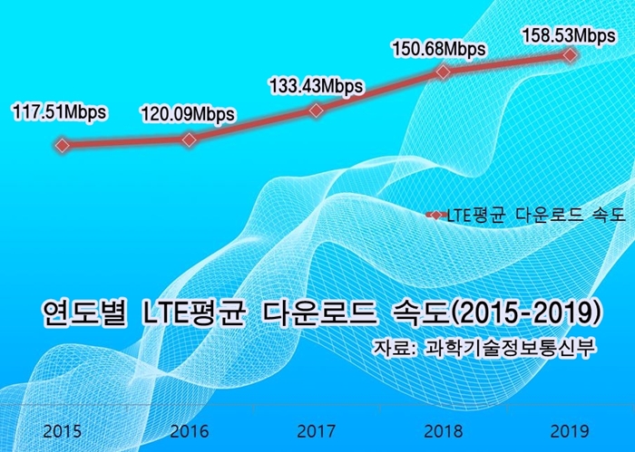 과학기술정보통신부(이하 과기정통부)간 지난 2015년부터 2018년까지 발표한 통신서비스 품질평가 자료에 따르면 LTE 평균 다운로드 속도는 △2015년 117.51Mbp △2016년 120.09Mbps △2017년 133.43Mbps △2018년 150.68Mbps으로 점차 상향됐다.