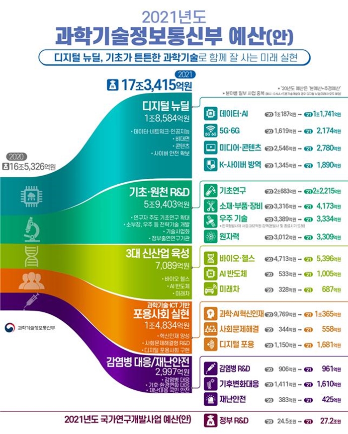 시사위크=박설민 기자 과학기술정보통신부(이하 과기정통부)는 1일 2021년 총 예산이 17조3,415억원으로 편성됐다고 밝혔다. 이는 올해 본 예산이었던 16조1,086억원 대비 7.7% 증가한 규모다. 올해 추경을 포함한 예산인 16조 5,326억원에 비해서도 4.9% 증가했다.