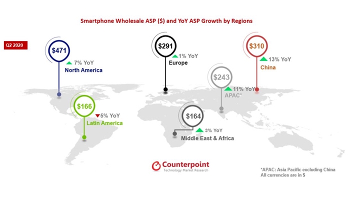 실제로 카운터포인트의 통계에 따르면 글로벌 스마트폰 ASP는 △미국 471달러 (전년대비 7%↑) △중국 310달러 (전년대비 13%↑)△유럽 291달러(전년대비 1%)△중앙아시아 및 아프리카 164달러(3%↑)△ 아시아 243달러 (11%↑) △라틴아메리카 166달러(5%↓)로 라틴아메리카를 제외한 세계 모든 지역의 스마트폰 ASP가 증가했다.