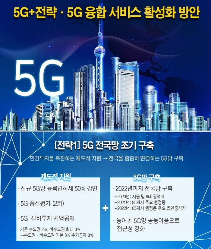 먼저 ‘5G 전국망 조기구축 촉진’ 계획에 따라 정부는 오는 2022년까지 전국 5G망을 촘촘히 연결할 계획이다. 특히 농어촌 지역에서 통신사 간 망 공동이용(로밍)을 추진해 5G접근성 강화한다는 목표다. 이를 위해 지난해 기준 최대 2% 수준이었던 5G 투자 세액 공제율도 상향(3%)하며, 등록면허세도 50% 감면해 5G 통신망 확산을 촉진한다.