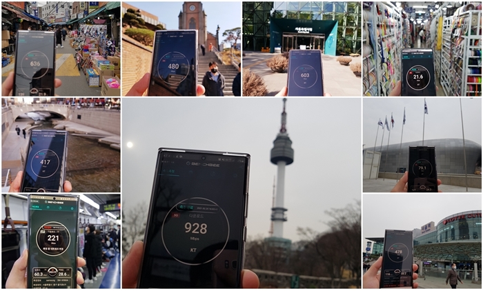남산 꼭대기에 위치해 5G신호가 잘 안 잡히지 않을까 우려했던 N서울타워(남산타워)는 예상 밖 결과가 나왔다. 전체 강북지역 측정 기록 가운데 가장 빠른 속도인 928Mbps를 기록했다.