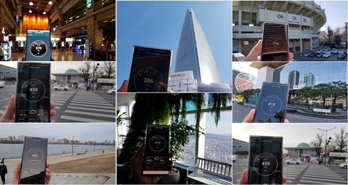 서울 강남지역의 랜드마크 중 하나인 롯데월드타워에서는 386~473Mbps의 속도가 측정됐다. 롯데월드타워 앞에선 386Mbps, 롯데월드타워 내부에서는 398Mbps의 수치가 나왔다. 120층에 위치한 전망대는 473Mbps로 나타났다. 대체로 아쉬운 속도지만, 5G 상용화 초기인 2019년 5G 신호가 거의 잡히지 않는다는 지적을 받았던 것에 비하면 크게 발전했다고 볼 수 있다.