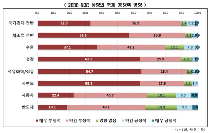 뿐만 아니라 2030 NDC 상향의 부문별 국제경쟁력 영향을 묻는 질문에는 대부분 부정적 영향을 끼칠 것이라는 전망이 높게 나타났다. 부문별로 부정적 영향을 예상하는 응답 비율은 △국가경제 전반 89.7% △제조업 전반 92.2% △수출 79.3% △철강 업종 89.7% △석유화학·정유 업종 93.1% △시멘트 업종 91.4% △자동차 68.1% △반도체 67.2% 등으로 나타났다. 특히 온실가스 배출량이 많은 철강, 석유화학·정유, 시멘트 업종은 매우 부정적이라는 응답률이 60% 이상을 기록했다.