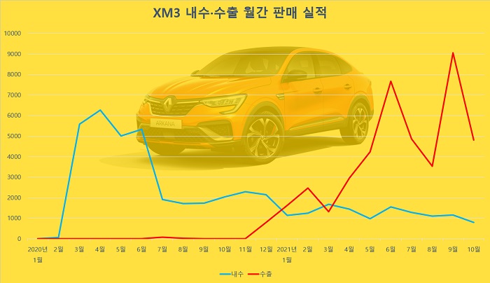 지난해 3월 한국 시장에 출시된 르노삼성 XM3는 출시 첫 해 3만4,091대를 기록하며 준수한 성적을 올렸다. 국내 출시 직후인 4개월 동안 내수 판매는 월 5,000대 이상을 꾸준히 기록하며 흥행가도를 달렸다. 그러나 지난해 7월부터 판매량은 감소세를 보이며, 월 2,000대 수준을 기록했다. 올해 들어서는 월 1,000∼2,000대 수준을 기록하다 지난달 1,000대 미만으로 떨어졌다.