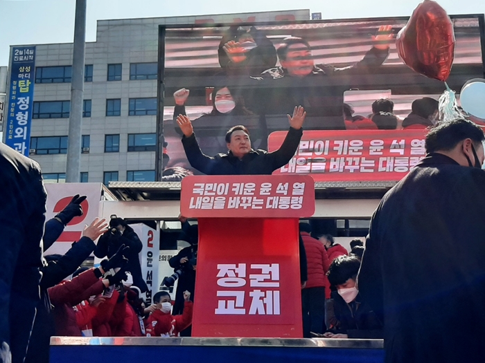 시사위크|성남·서초=권신구 기자 수도권 집중 유세에 나선 윤석열 국민의힘 대선후보가 이재명 더불어민주당 ′본진’을 넘나들었다. 경기도 안성에서 유세 행보를 시작한 윤 후보는 이재명 후보의 본진격인 경기도 성남을 찾아 이 후보를 향해 활시위를 겨눴다. 이어 그는 본인의 터전이었던 서울 서초구를 찾아 민주당에 대한 심판을 호소했다.