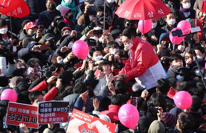 서초 유세에 나선 윤 후보의 공세 포인트는 ‘부동산’이었다. 그는 “이 사람들은 도무지 건국 이래 구경하지도 못한 이런 집값 폭등을 만들어 냈다. 스물여덟 번의 주택 정책으로 계속 실패를 거듭해 왔다”며 “저는 이 사람들이 실수한 거라고 생각지 않는다. 이건 일부러 악의적으로 집값을 폭등시킨 것”이라고 맹폭했다. 양극화를 심화시켜 서민들의 표를 받기 위한 정치적 술수라는 설명이다.
