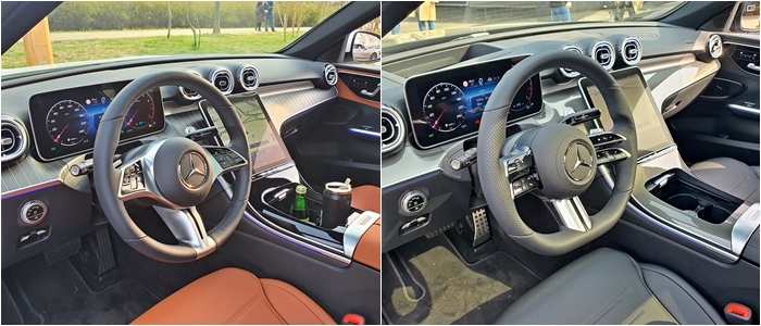 스티어링휠 디자인은 C200이 일반적인 원형 3포크 형태로 디자인됐고 두께가 얇다. C300은 두꺼운 D컷 스티어링휠을 적용해 스포티함을 강조했다. 스티어링휠에 쓰인 가죽이나 3·6·9시 방향으로 뻗은 포크의 마감 소재도 다른데, C300에만 나파가죽이 쓰여 조금 더 고급스럽다. 패들시프트도 C300은 알루미늄 소재, C200은 검은색 플라스틱 소재를 사용해 조작감에서 상당한 차이가 나타난다.