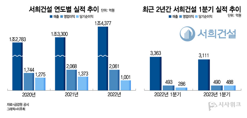 최근 3년간 연결기준 서희건설의 매출은 1조2,783억원(2020년), 1조3,300억원(2021년), 1조4,377억원(2022년)으로 꾸준히 성장하는 추세다.