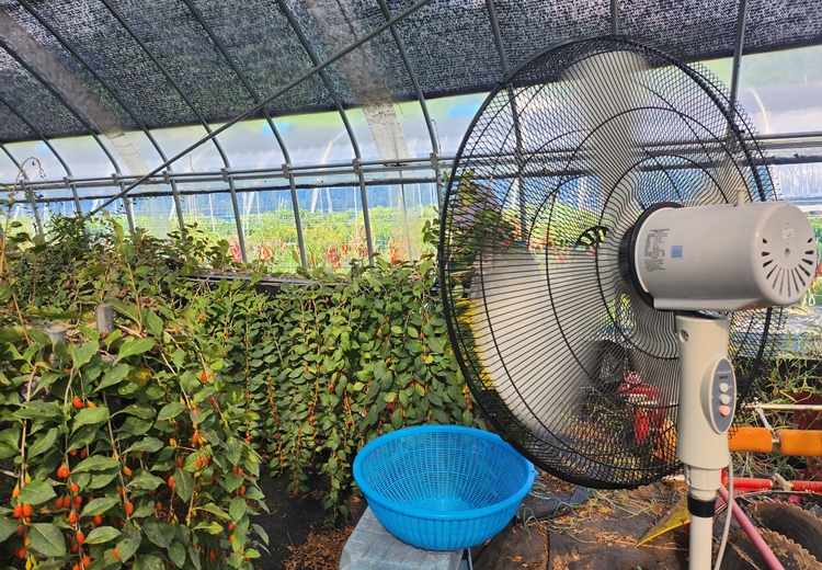 아내의 강력한 주장으로 대형선풍기도 샀다. 구기자를 딸 때 시원하게 하기 위해서다. 근데 문제가 있었다. 수확 일은 이동을 하면서 하기 때문에 선풍기도 20분마다 옮겨야 했다. 또 그때마다 선풍기를 둘 공간도 마땅치 않았다. 결국 쉴 때만 이용하고 있다. 그렇게 사지말자고 했는데 아내의 고집을 못 꺾는다.