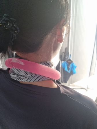 온도를 낮추기 위한 시도도 이것저것 해봤다. ‘넥 밴드’라고 요즘 뜨는 아이템도 써봤다. 얼려서 목에 두르는 건데, 처음엔 엄청 시원해서 만족스러웠다. 그러나 너무 더워서 그런지 30분만 지나면 다 녹았고, 이후 오히려 뜨거워지고 불편했다. 그래서 딱 30분 만이라도 시원하게 사용할 용도로 오후에 쓰고 있다.