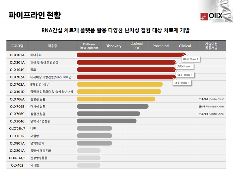 “현재 올릭스는 RNA간섭 치료제 플랫폼 활용, 다양한 난치성 질환 대상 치료제 개발하고 있다. 파이프라인은 총 16개가 진행 중이다. 그중 미국, 호주 등 국가에서 ‘OLX101A(비대흉터), ‘OLX301A(건성 및 습성 황반변성)’, ‘OLX104C(탈모)’, ‘OLX702A(대사이상 지방간염(MASH)/비만)’ 등 4종의 프로그램이 글로벌 임상테스트에 들어갔다. 또한 심혈관 질환, 대사성 질환을 위한 ‘OLX706A’, ‘OLX706B’, ‘OLX706C’ 등 3종은 현재 중국 한소제약과 공동개발을 진행 중인 프로그램이다.”