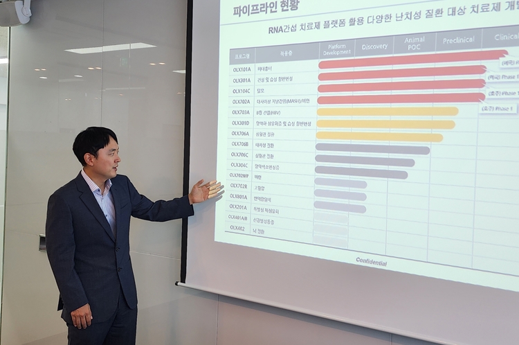 “대표적으로는 지방간염(MASH) 치료 프로그램 ‘OLX702A’을 꼽을 수 있다. 대사이상관련 지방간염(MASH) 발병 유전자 발현을 억제, 지방간과 간염, 섬유증을 개선하는 RNA 간섭 치료제다. 타겟 발굴 당시 ‘영국(UK)바이오뱅크’ 등 유전자 데이터베이스를 활용한 GWAS(전장유전체 연관분석) 결과를 분석하고 MARC1이라는 유전자에 주목을 하게 됐다. MARC1 유전자에 변이가 있을 때 지방간 및 간섬유화의 빈도가 대폭 감소하는 것이 보고됐고, 간질환으로 인한 사망률도 40%가 줄었다. 이에 MARC1의 발현을 억제하는 GalNAc-asiRNA 치료제 OLX702A 개발에 착수했다. 실험용 쥐, 원숭이를 활용한 동물실험 결과 지방간염/간섬유화 증상 및 기타 지표가 크게 회복된 것을 확인했다. 특히 생쥐 간섬유화 모델에서 지방간염으로 인한 간 섬유화가 최대 50% 감소하는데 성공했다. 현재는 호주에서 임상 1상을 진행 중에 있다.”