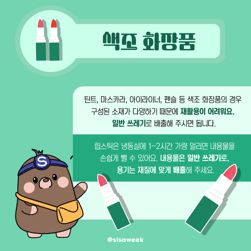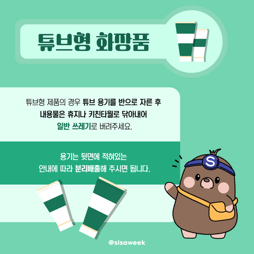 자료=서울특별시, 그래픽=이주희 #모리잇수다 #모리툰 #모리 #화장품 #재활용 #분리수거 #방법 관련기사 [모리잇수다] 제21대 대선, ‘사전투표’ 미리 알고 똑똑하게! [모리잇수다] 6.3대선, 투표소에서 이러면 안돼요! 키워드 #모리잇수다 #모리툰 #모리 #화장품 #재활용 #분리수거 #방법 이주희 그래픽 디자이너 dlwngml101@sisaweek.com 다른기사 보기 저작권자 © 시사위크 무단전재 및 재배포 금지 SNS 기사보내기 페이스북(으)로 기사보내기 트위터(으)로 기사보내기 카카오스토리(으)로 기사보내기 카카오톡(으)로 기사보내기 구글+(으)로 기사보내기 네이버밴드(으)로 기사보내기 네이버블로그(으)로 기사보내기 핀터레스트(으)로 기사보내기 URL복사(으)로 기사보내기 텔레그램(으)로 기사보내기 이메일(으)로 기사보내기 다른 공유 찾기 기사스크랩하기 이 기사를 공유합니다 페이스북(으)로 기사보내기 트위터(으)로 기사보내기 카카오스토리(으)로 기사보내기 카카오톡(으)로 기사보내기 구글+(으)로 기사보내기 네이버밴드(으)로 기사보내기 네이버블로그(으)로 기사보내기 핀터레스트(으)로 기사보내기 URL복사(으)로 기사보내기 텔레그램(으)로 기사보내기 닫기 개의 댓글 회원로그인 작성자 비밀번호 댓글 내용입력 댓글 정렬 최신순 추천순 답글순 BEST댓글 BEST 댓글 답글과 추천수를 합산하여 자동으로 노출됩니다. 닫기 더보기 댓글삭제 삭제한 댓글은 다시 복구할 수 없습니다. 그래도 삭제하시겠습니까? 비밀번호 닫기 댓글수정 댓글 수정은 작성 후 1분내에만 가능합니다. 본문 / 400 비밀번호 닫기 내 댓글 모음 닫기