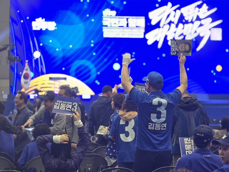 지지자들은 이재명, 김경수, 김동연 등 각 후보가 등장할 때마다 이름을 연호하며 엄청난 함성을 쏟아냈다. 응원봉과 지지하는 후보자의 이름이 적힌 손팻말, 풍선 등 다양한 응원도구도 등장했다. 후보들도 지지자들의 응원에 손을 흔들거나 악수를 하며 화답했다.