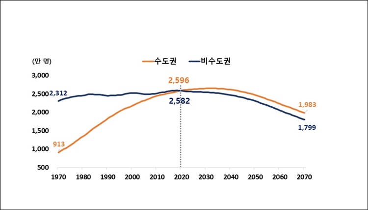 반세기 가량 세월이 흐른 지금은 어떠한가. 수도권 인구는 2019년 비수도권 인구를 넘어선 후 갈수록 격차가 커지고 있다. 통계청이 2020년 발표한 ‘최근 20년간 수도권 인구이동과 향후 인구전망’ 자료에 따르면 우리나라의 총 인구는 앞으로 수십 년간 감소세를 보이는 가운데, 수도권과 비수도권의 인구 격차가 커질 것으로 예상되고 있다.