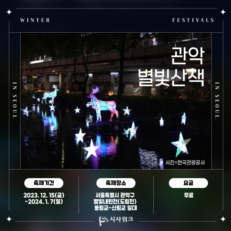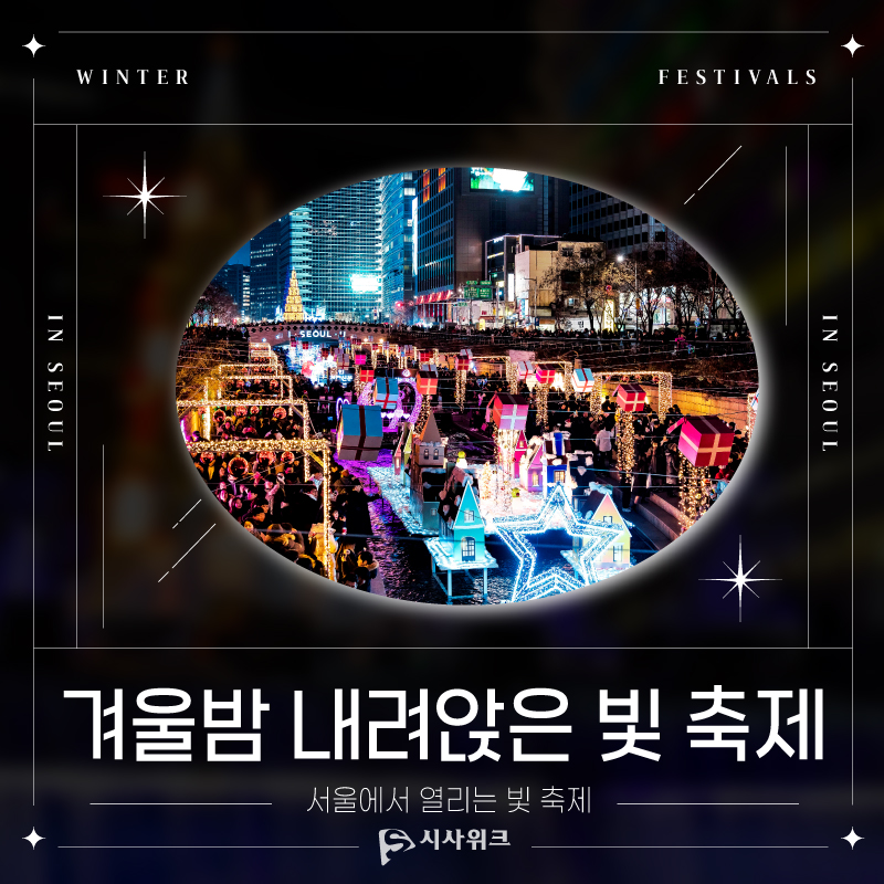 사진=겨울 청계천의 빛 홈페이지 사진=서울빛초롱축제 인스타그램 사진=한국관광공사 사진=한국관광공사 키워드 #빛 축제 #축제 #빛 #서울 #밤 #겨울 청계천의 빛 #서울빛초롱축제 #송현동 솔빛축제 #관악 별빛산책 이주희 그래픽 디자이너 dlwngml101@sisaweek.com 다른기사 보기 저작권자 © 시사위크 무단전재 및 재배포 금지 SNS 기사보내기 페이스북(으)로 기사보내기 트위터(으)로 기사보내기 카카오스토리(으)로 기사보내기 카카오톡(으)로 기사보내기 구글+(으)로 기사보내기 네이버밴드(으)로 기사보내기 네이버블로그(으)로 기사보내기 핀터레스트(으)로 기사보내기 URL복사(으)로 기사보내기 텔레그램(으)로 기사보내기 이메일(으)로 기사보내기 다른 공유 찾기 기사스크랩하기 이 기사를 공유합니다 페이스북(으)로 기사보내기 트위터(으)로 기사보내기 카카오스토리(으)로 기사보내기 카카오톡(으)로 기사보내기 구글+(으)로 기사보내기 네이버밴드(으)로 기사보내기 네이버블로그(으)로 기사보내기 핀터레스트(으)로 기사보내기 URL복사(으)로 기사보내기 텔레그램(으)로 기사보내기 닫기 개의 댓글 회원로그인 작성자 비밀번호 댓글 내용입력 댓글 정렬 최신순 추천순 답글순 BEST댓글 BEST 댓글 답글과 추천수를 합산하여 자동으로 노출됩니다. 닫기 더보기 댓글삭제 삭제한 댓글은 다시 복구할 수 없습니다. 그래도 삭제하시겠습니까? 비밀번호 닫기 댓글수정 댓글 수정은 작성 후 1분내에만 가능합니다. 본문 / 400 비밀번호 닫기 내 댓글 모음 닫기