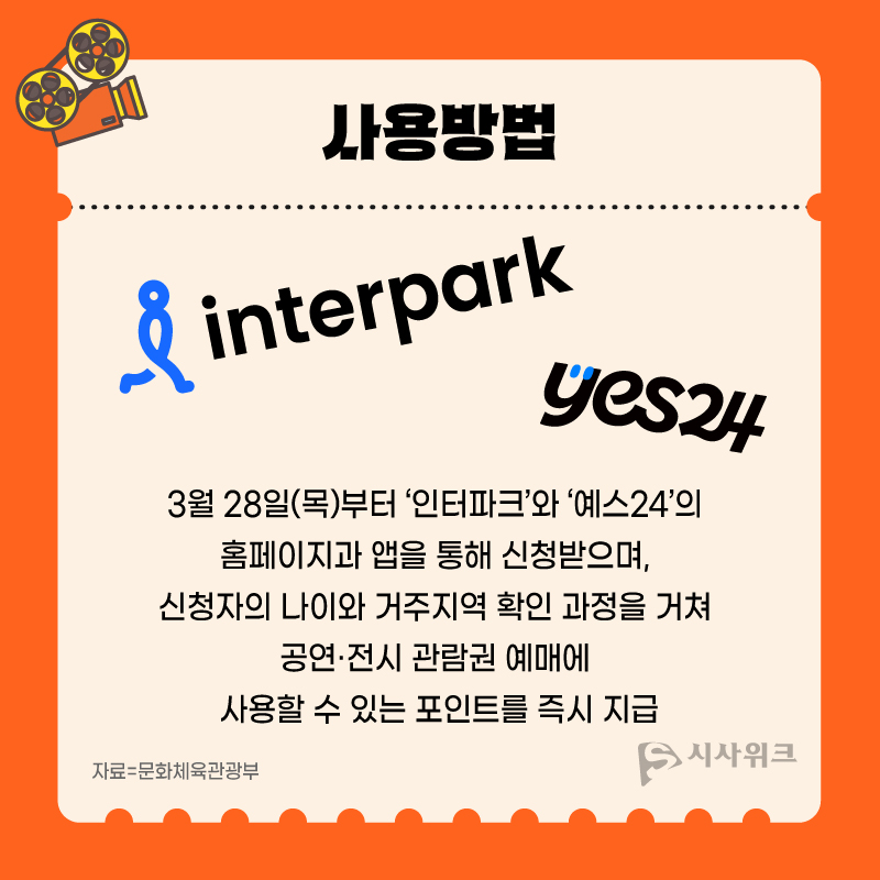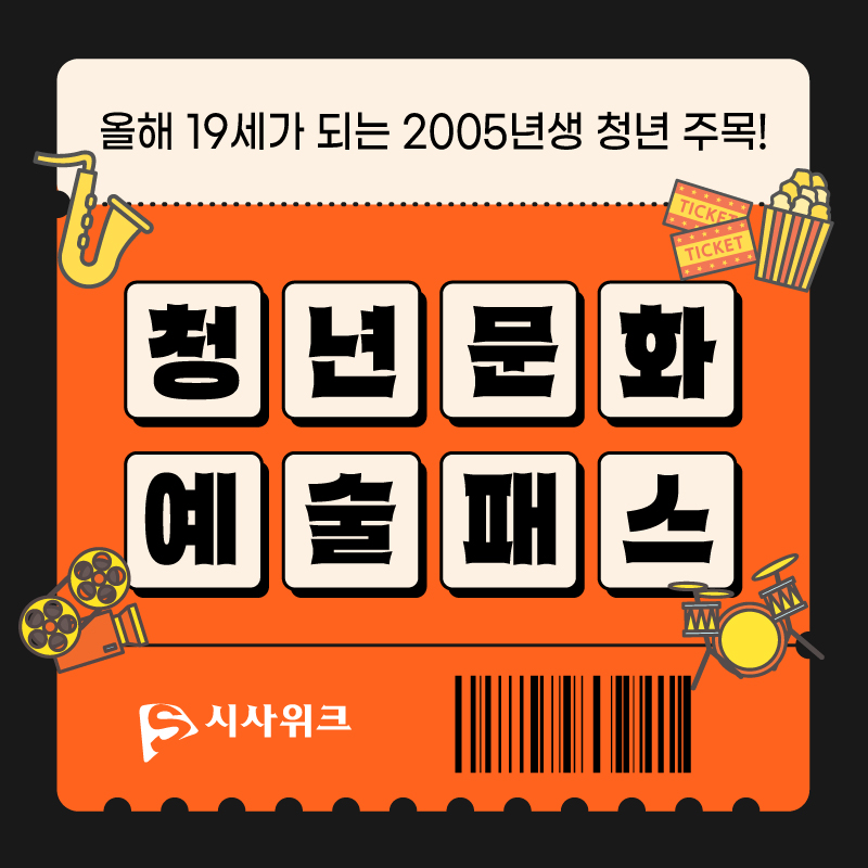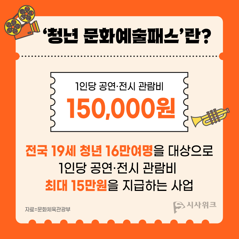 '청년문화예술패스', 19세 청년 16만명 대상 공연·전시 관람비 지급 사업 자료=문화체육관광부, 그래픽=이주희 #문화체육관광부 #문화 #예술 #청년문화예술패스 #청년 #2005년생 #만19세 #문화혜택 #15만원 #예스24 #인터파크 키워드 #문화체육관광부 #문화 #예술 #청년문화예술패스 #청년 #2005년생 #만19세 #문화혜택 #15만원 #예스24 #인터파크 이주희 그래픽 디자이너 dlwngml101@sisaweek.com 다른기사 보기 저작권자 © 시사위크 무단전재 및 재배포 금지 SNS 기사보내기 페이스북(으)로 기사보내기 트위터(으)로 기사보내기 카카오스토리(으)로 기사보내기 카카오톡(으)로 기사보내기 구글+(으)로 기사보내기 네이버밴드(으)로 기사보내기 네이버블로그(으)로 기사보내기 핀터레스트(으)로 기사보내기 URL복사(으)로 기사보내기 텔레그램(으)로 기사보내기 이메일(으)로 기사보내기 다른 공유 찾기 기사스크랩하기 이 기사를 공유합니다 페이스북(으)로 기사보내기 트위터(으)로 기사보내기 카카오스토리(으)로 기사보내기 카카오톡(으)로 기사보내기 구글+(으)로 기사보내기 네이버밴드(으)로 기사보내기 네이버블로그(으)로 기사보내기 핀터레스트(으)로 기사보내기 URL복사(으)로 기사보내기 텔레그램(으)로 기사보내기 닫기 개의 댓글 회원로그인 작성자 비밀번호 댓글 내용입력 댓글 정렬 최신순 추천순 답글순 BEST댓글 BEST 댓글 답글과 추천수를 합산하여 자동으로 노출됩니다. 닫기 더보기 댓글삭제 삭제한 댓글은 다시 복구할 수 없습니다. 그래도 삭제하시겠습니까? 비밀번호 닫기 댓글수정 댓글 수정은 작성 후 1분내에만 가능합니다. 본문 / 400 비밀번호 닫기 내 댓글 모음 닫기