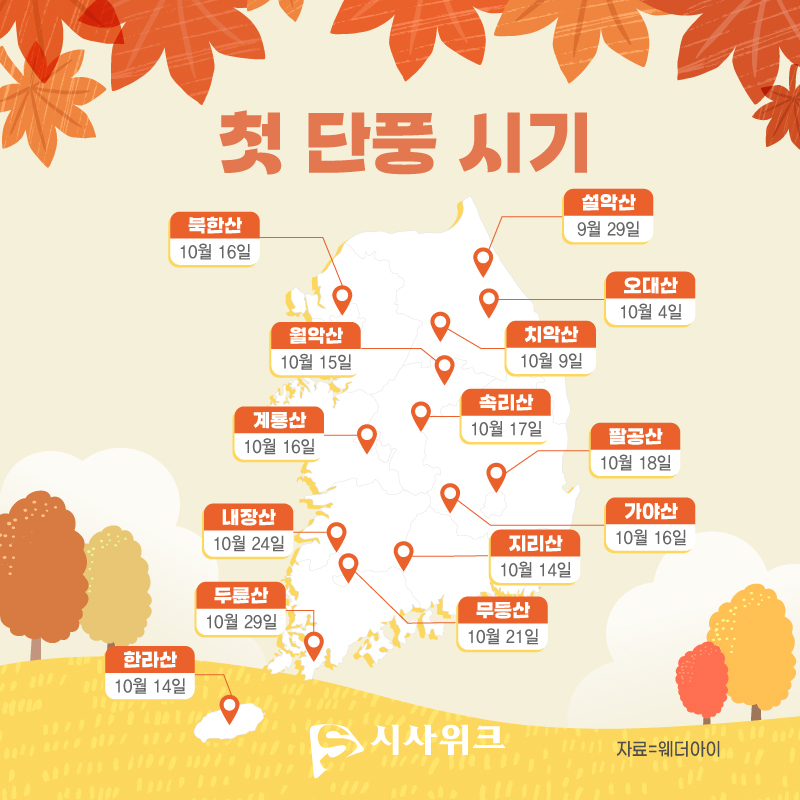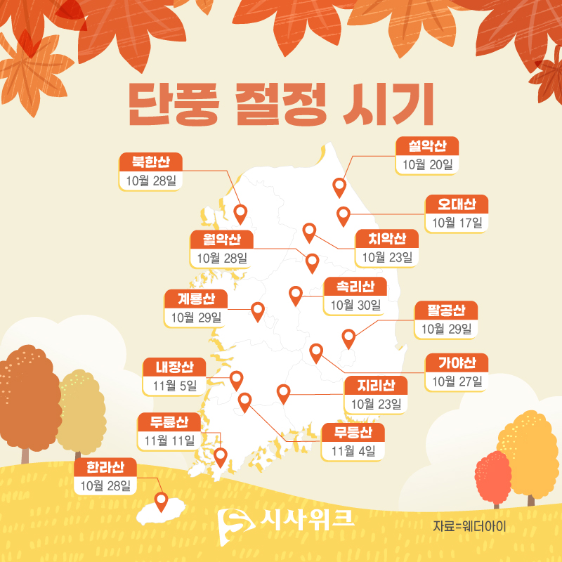 자료=웨더아이, 그래픽=이주희 #단풍 #가을 #단풍시기 #2024단풍 #2024단풍시기 #단풍여행 #단풍명소 #단풍절정 #가을단풍 #가을여행 #가을명소 #가을등산 #설악산 #북한산 키워드 #단풍 #가을 #단풍시기 #2024단풍 #2024단풍시기 #단풍여행 #단풍명소 #단풍절정 #가을단풍 #가을여행 #가을명소 #가을등산 #설악산 #북한산 이주희 그래픽 디자이너 dlwngml101@sisaweek.com 다른기사 보기 저작권자 © 시사위크 무단전재 및 재배포 금지 SNS 기사보내기 페이스북(으)로 기사보내기 트위터(으)로 기사보내기 카카오스토리(으)로 기사보내기 카카오톡(으)로 기사보내기 구글+(으)로 기사보내기 네이버밴드(으)로 기사보내기 네이버블로그(으)로 기사보내기 핀터레스트(으)로 기사보내기 URL복사(으)로 기사보내기 텔레그램(으)로 기사보내기 이메일(으)로 기사보내기 다른 공유 찾기 기사스크랩하기 이 기사를 공유합니다 페이스북(으)로 기사보내기 트위터(으)로 기사보내기 카카오스토리(으)로 기사보내기 카카오톡(으)로 기사보내기 구글+(으)로 기사보내기 네이버밴드(으)로 기사보내기 네이버블로그(으)로 기사보내기 핀터레스트(으)로 기사보내기 URL복사(으)로 기사보내기 텔레그램(으)로 기사보내기 닫기 개의 댓글 회원로그인 작성자 비밀번호 댓글 내용입력 댓글 정렬 최신순 추천순 답글순 BEST댓글 BEST 댓글 답글과 추천수를 합산하여 자동으로 노출됩니다. 닫기 더보기 댓글삭제 삭제한 댓글은 다시 복구할 수 없습니다. 그래도 삭제하시겠습니까? 비밀번호 닫기 댓글수정 댓글 수정은 작성 후 1분내에만 가능합니다. 본문 / 400 비밀번호 닫기 내 댓글 모음 닫기