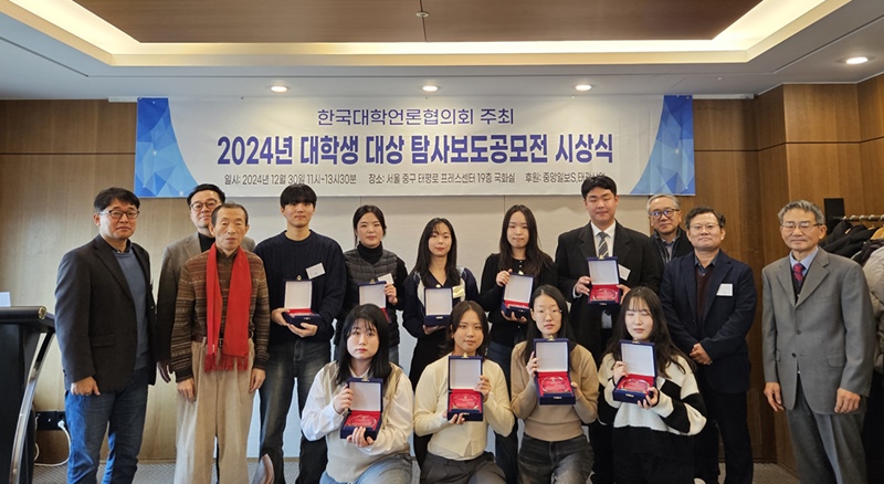 시사위크=강준혁 기자 한국대학언론협의회(회장 오대영 가천대 교수)는 30일 서울 태평로 프레스센터 19층에서 ‘대학생 대상 탐사보도 공모전’ 시상식을 열고, 우수상 1편과 장려상 2편을 시상했다. 이번 공모전은 중앙일보S와 태광산업이 후원했다.