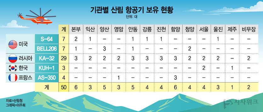 반면 러시아 카모프사의 ‘KA-32’모델은 29대가 운영 중인 것으로 나타났다. 전체 산림헬기의 58%가 러시아제인 셈이다. 미국산 헬기도 14대를 차지했다. 각각 ‘에릭슨 에어크레인’에서 제작한 ‘S-64(7대)’와 ‘벨 헬리콥터’에서 제작한 ‘BELL-206(7대)’다. 119항공대 헬기에서 큰 비중을 차지한 프랑스 아에로스 파시알의 ‘AS-350’ 모델도 4대가 운용 중이다.